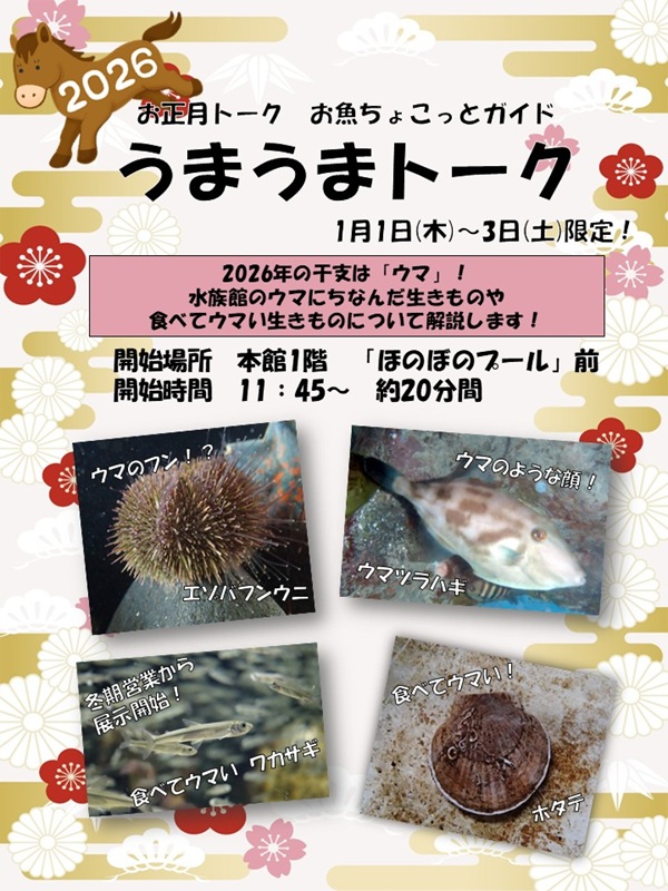 ・ ・ ◍お魚ちょこっとガイド うまうまトーク ・日時:2026年1月1日(木・祝)~3日(土) 11:45~12:05 ・場所:本館1階ほのぼのプール前 ※2026年は「うま年」ということで、飼育員が「馬」「旨い」にちなんだ 生きものの話をしながら、館内の水槽をご案内します。