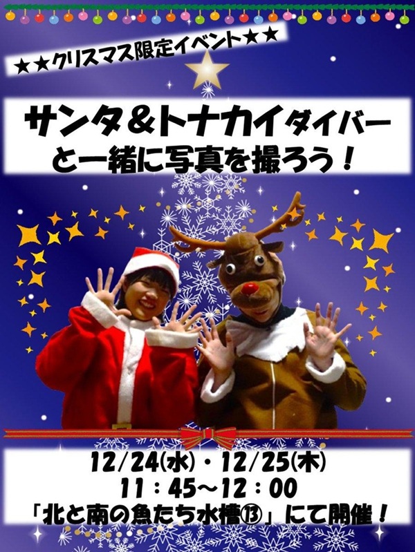 ・日時:2025年12月24日(水)・25日(木) 11:45 ~ 12:00 ・場所:本館1階「北と南の魚たち 水槽13号」※チンアナゴがいる水槽の隣です。 例年サンタが水槽に潜りますが、 今年はトナカイがダイバーとして水槽に潜ります。 水槽前でサンタも含めて記念撮影できます。