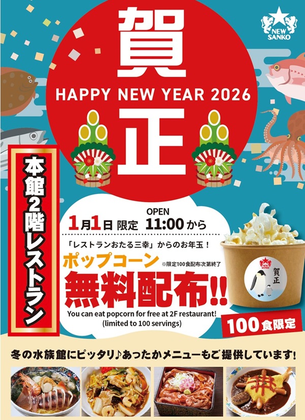 おたる水族館は冬期営業中。お正月も毎日営業します。 営業時間 10:00~16:00(入館は15:30まで) 屋外でのイベントは寒いので、暖かい服装・滑りにくい靴でお越しください。 運がよければ野生のトドやアザラシなどもごらんいただけます。 / おたる水族館2026年 年始イベントをご紹介します。 ・ ◍ポップコーン無料提供 ・日時:2026年1月1日(木・祝) 11:00 ~(無くなり次第終了) ・場所:本館2階レストランおたる三幸 ※100名様分を用意してお待ちしています。