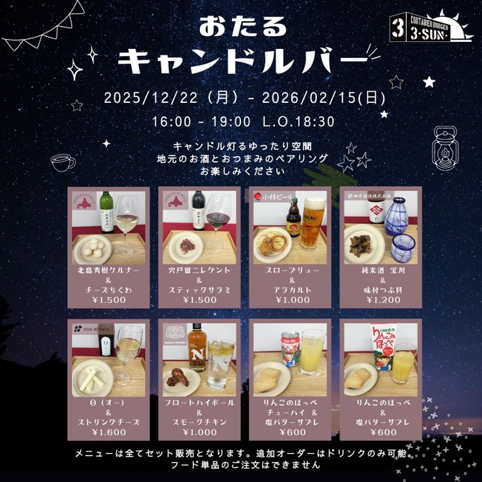 ◇旧北海製罐第3倉庫ライトアップ(通年点灯) 休館日⇒毎月第4水曜日(祝日の場合はその翌日※12/3.10.17.24.31・1/1.2 全館休館 12月のカレンダーはコチラから ◎冬季ナイトオープン…12月1日(土)~2026年2月14日(土)浮世絵美術館のみ毎週土曜日19:00まで開館 ◎浮世絵美術館のみ・ナイトオープン~19:00まで時間延長(12/6.13.20.27) ◎西洋美術館ショップ開館⇒10:00~18:00・毎週土曜日⇒10:00~20:00※12/30.31⇒11:00~15:00開館 12/20・21・25〜28は12:00・14:30、12/22・24は14:30。各回投影の1時間30分前から正面窓口で整理券を配布。各回先着30名(問) 0134-33-2523 総合博物館 ◎元海猫屋店主・増山誠氏の所蔵品などで往時の海猫屋の一端を再現し、舞踏家・田仲ハル氏所蔵の舞踏公演ポスターなどを展示(問) 0134-34-0035 市立小樽美術館 クリスマスイベント(12/20.21)小樽国際インフォメーションセンター・前広場特設会場・ ・ 月間イベント情報 ⇒ 12月のイベント・おすすめ情報 ・ ★ブログと一緒にfacebook「OtaruStyle」も是非ごらんください。 ・旧ブログ 「小樽観光案内所スタッフブログ」その1 ・旧ブログ 「小樽観光案内所スタッフブログ」その2 ・旧ブログ 「小樽観光案内所スタッフブログ」その3 ・