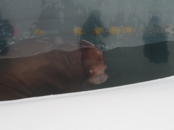 ・ ・ セイウチ館 今の発情時期はオスのウチオとメスのウーリャとつむぎを分けて飼育しています。 ウーリャは高齢で出産は体調の負担が大きいので、妊娠しないよう分けているそうです。 「セイウチとホッキョクグマ、戦うと、どちらが勝つと思いますか。」 などの質問もありました。 ・ 大きい方のプールはオスの「ウチオ」