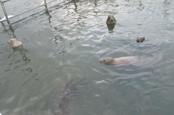 ・ プールはオス、メス、おじいちゃんに分けています。 おじいちゃんは白内障などで目が見えていない個体もいて、 若いトドと一緒にすると食い負けしてしまうので、わけているそうです。