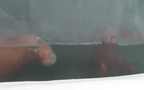 ・ 小さい方のプールにメスの「ウーリャ」と娘の「つむぎ」 つむぎは4歳。体重は現在400㎏ぐらいあるそうです。