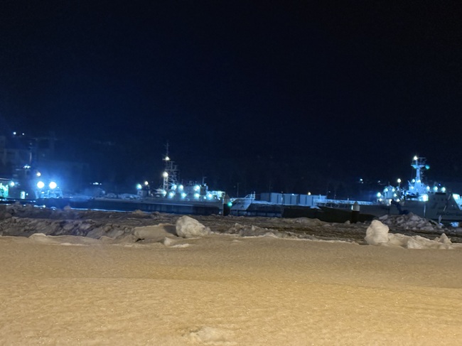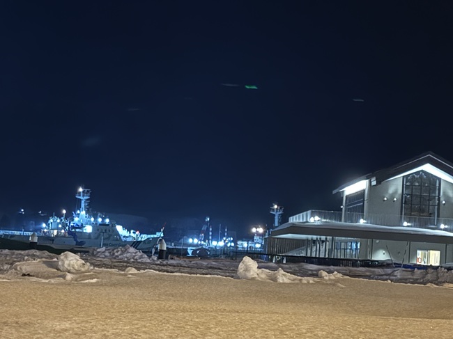 (↓2/14 20:10過ぎ…「ポート・オブ・ザ・イヤー2024」を受賞した国際インフォメーション向かいの観光船ターミナルセンターの夕景。 )[ヨ]