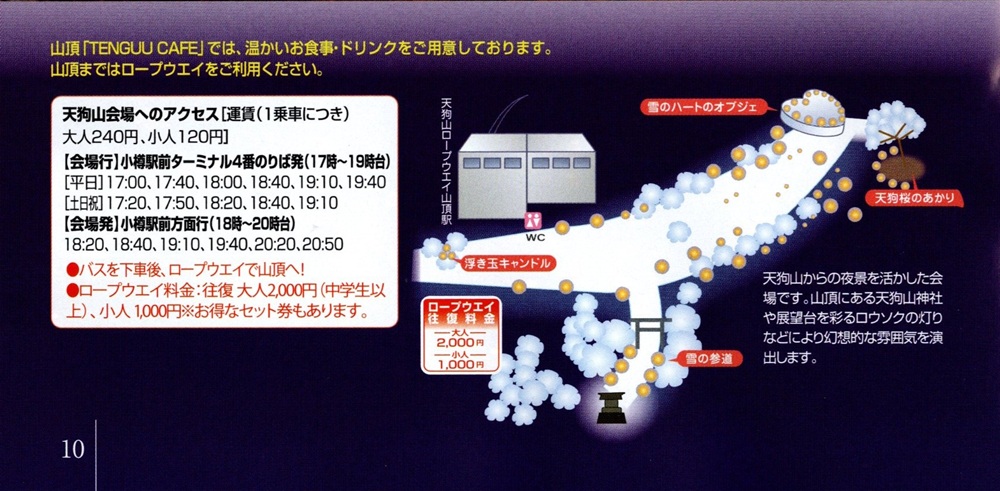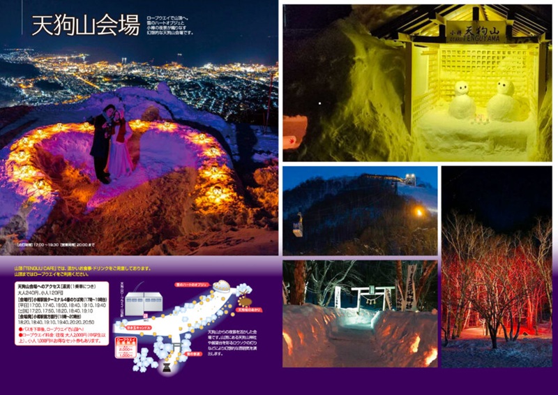 ・ロープウェイで山頂へ。雪のハートオブジェと小樽の夜景が織りなす幻想的な天狗山会場です。山頂では、温かいお食事やドリンクをご用意しています。