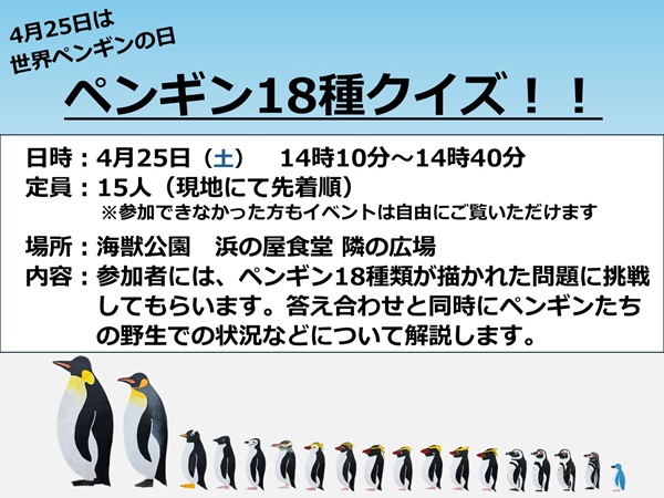・ ・ 4.期間中の特別イベント ■4月25日(土) ペンギン18種クイズ 【時間】14:10~14:40 【場所】海獣公園 浜の屋食堂 隣の広場 【定員】15名(現地にて先着順) 世界に18種類いるペンギンの絵を見て問題に挑戦していただきます。 答え合わせをしながらペンギンたちの野生での状況について解説します。 回答用紙の配布は15名限定ですが、そのほかの方も自由にご覧いただけます。