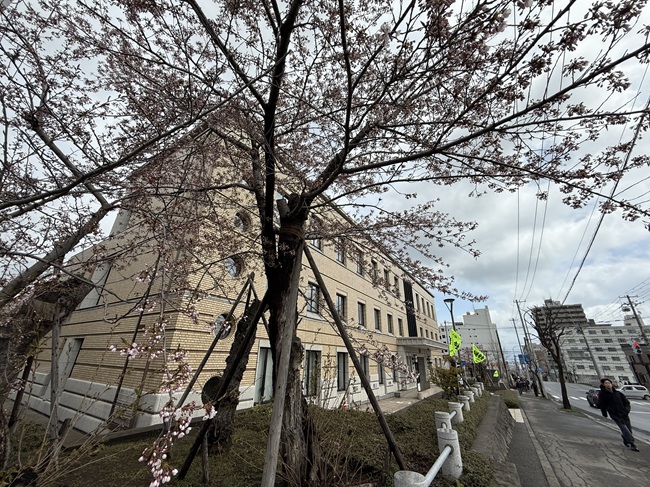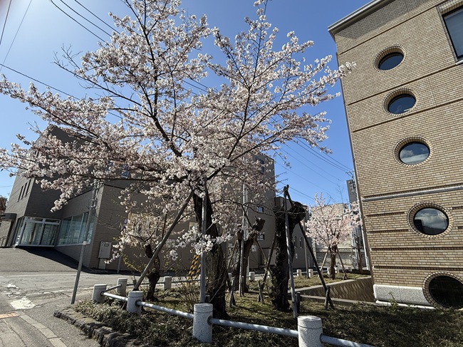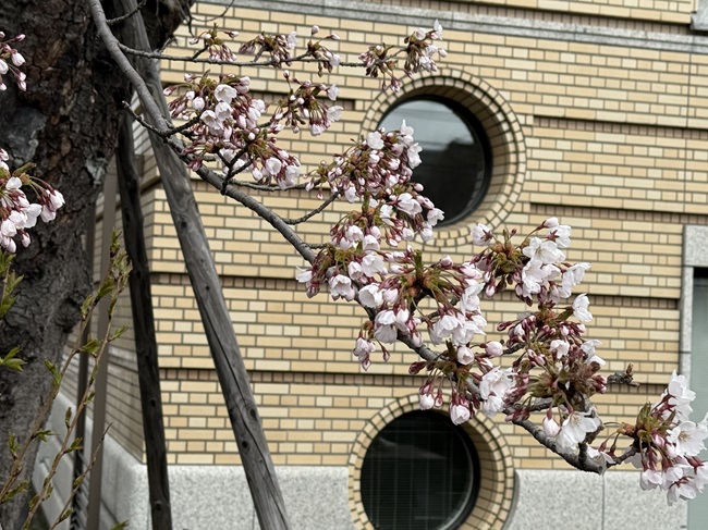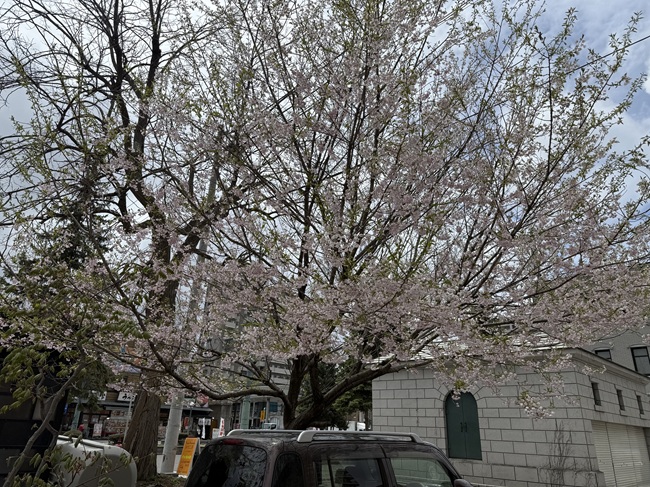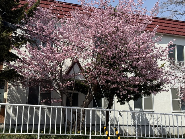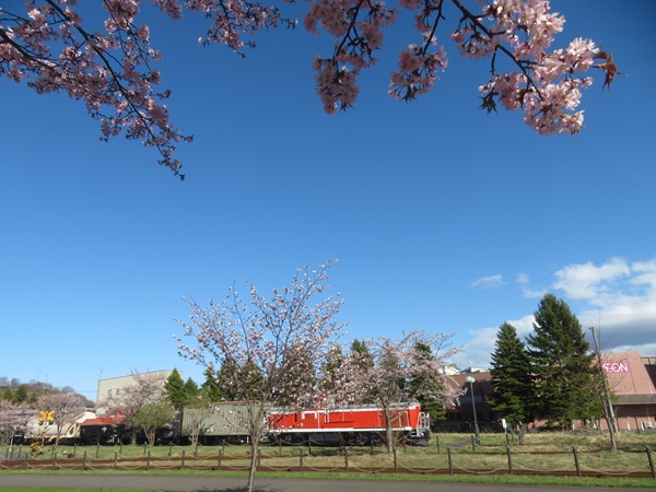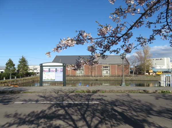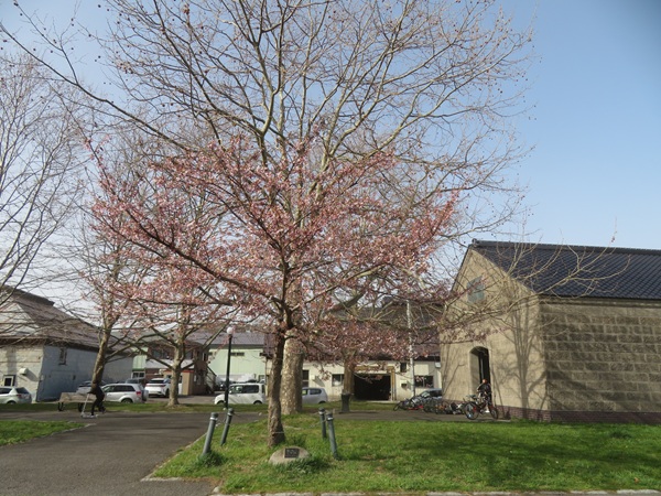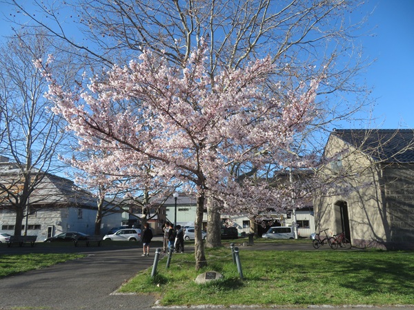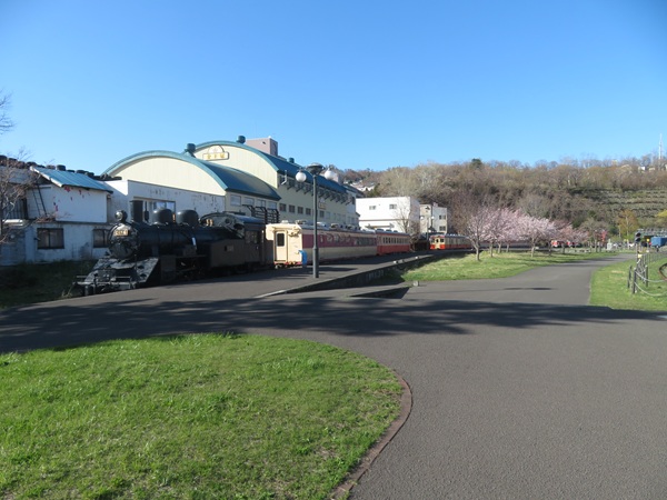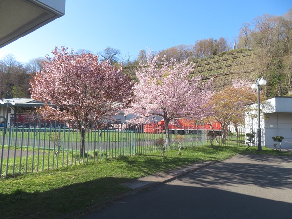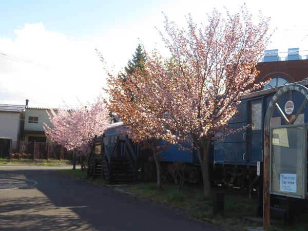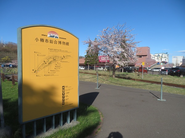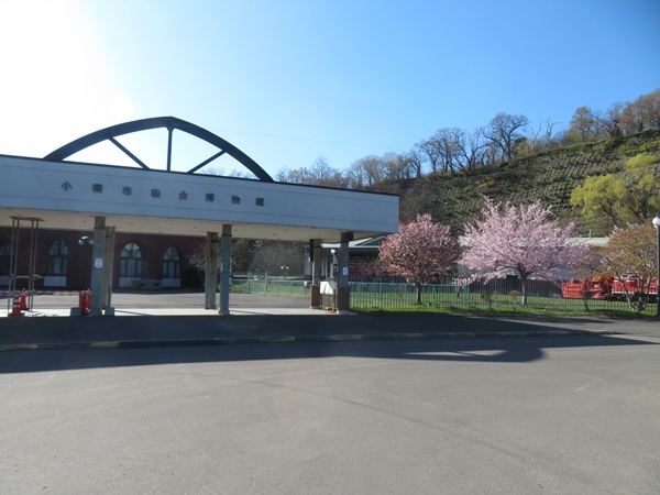 2026年4月23日(木)の小樽市総合博物館本館の桜です。 正面入り口横の桜は満開。 蒸気機関車アイアンホース号の線路沿いの桜など 屋外展示場でも桜が咲いていました。 ・ 正面入口 4月19日(日)よりも満開の桜が増えていました。