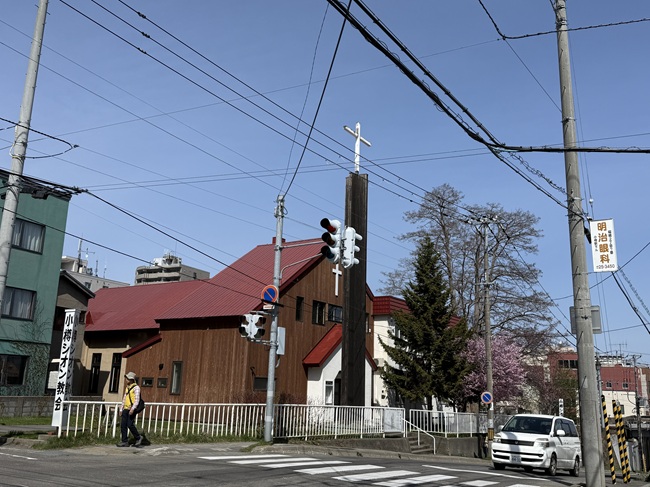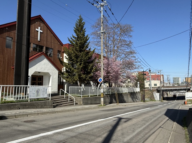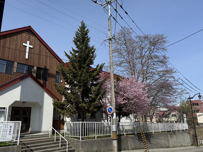 4月23日(木)の午後1時半頃、元総合福祉センターの1本桜もほぼ満開になってきました。工事中のため、柵がしてあり、近くで撮れませんでしたが、満開の桜は見応えありました。 ![]() ![]() ![]() ![]() ・ 4月20日のシオン教会は5分咲きくらいでした。遠くから見てもピンク色が鮮やかな花が咲いていました。 ![]() ・