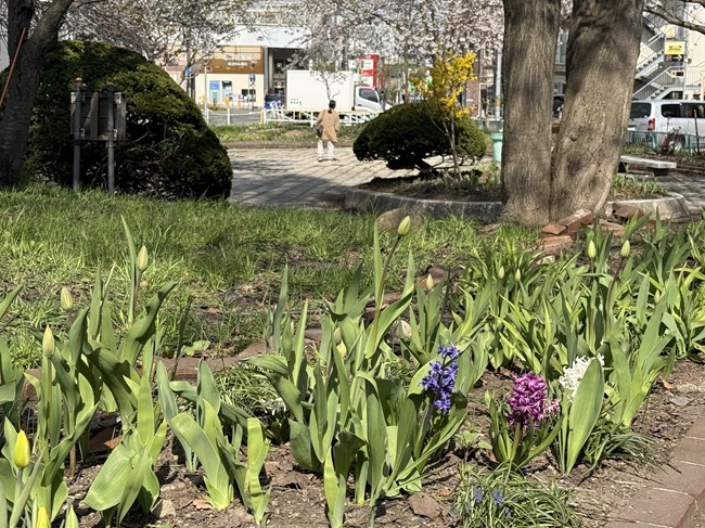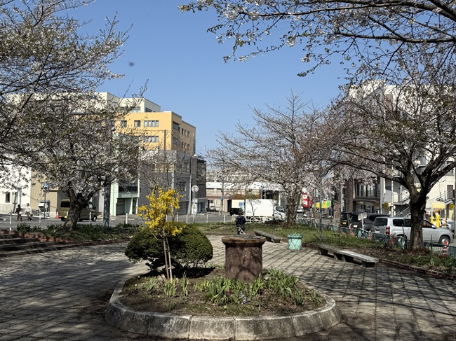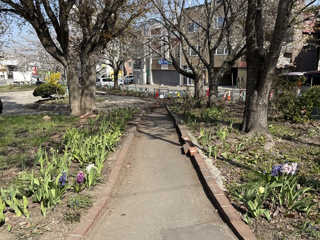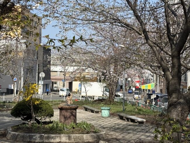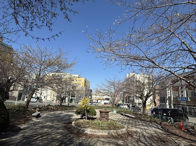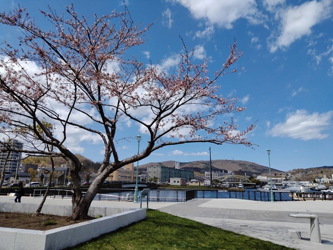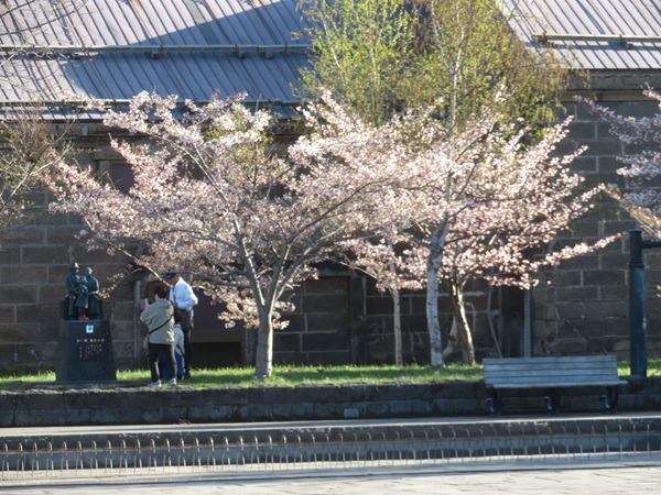 2026年4月23日(木)の運河公園の桜です。 小樽運河沿いの桜と「小樽運河を守る会」会長だった峯山冨美さんの桜が はほぼ満開。 赤い靴の親子の像とブランコがある側の桜は咲き始めや5分咲きぐらいの桜があります。