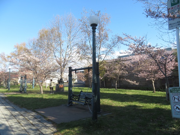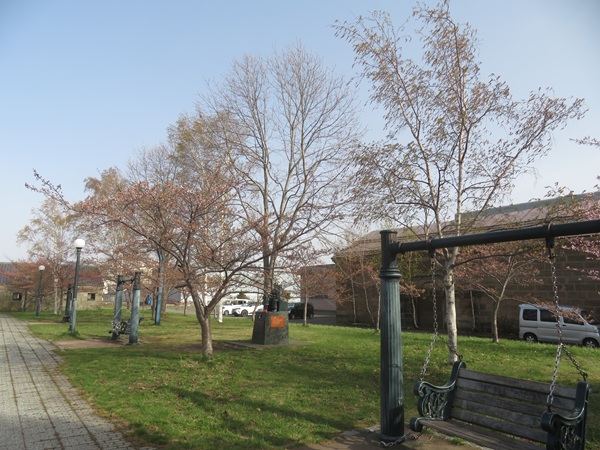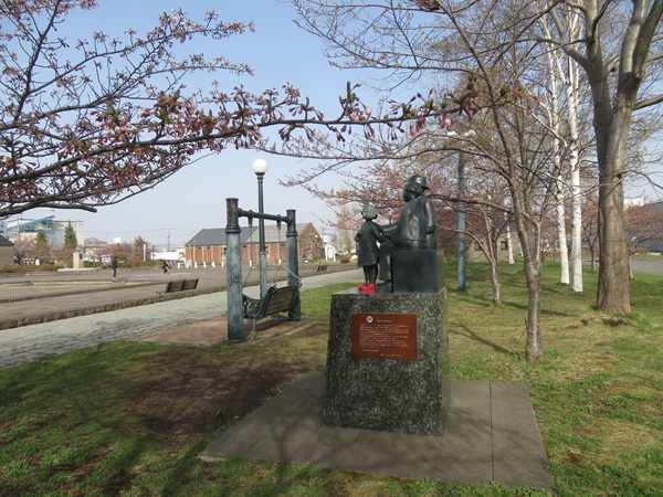 ・ ・ 赤い靴の親子の像とブランコがある側の桜