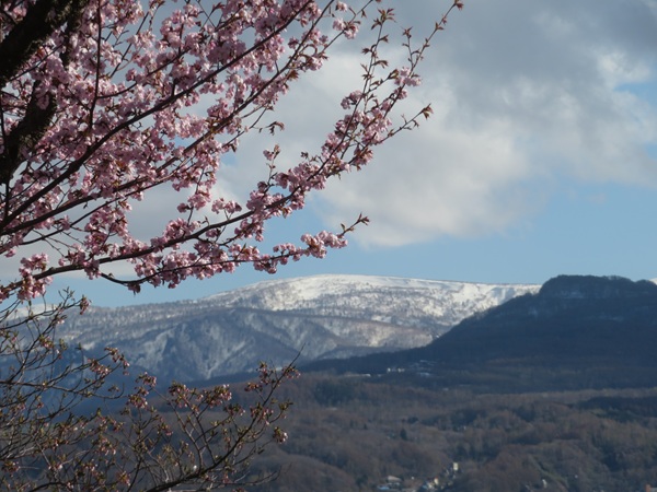 ・ ・ 屋外展示場 雪が残る天狗山と桜