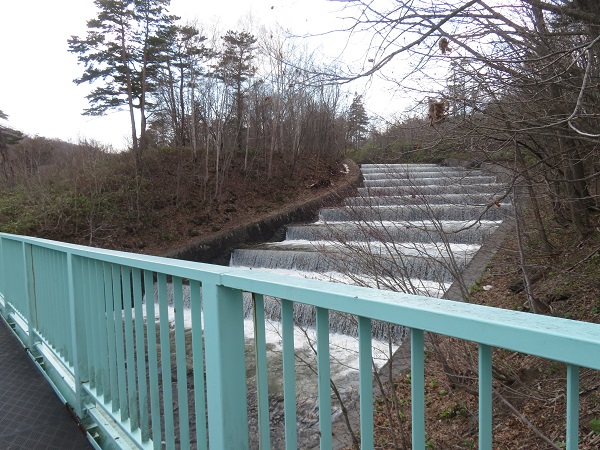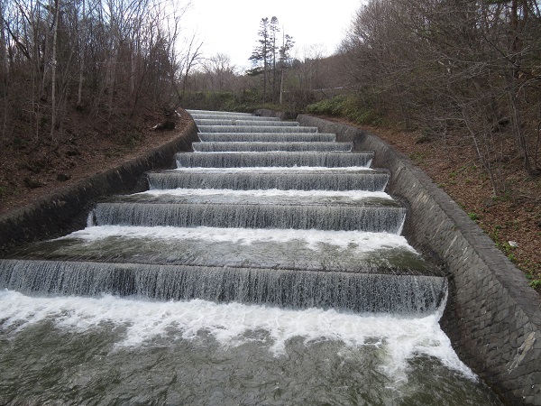 階段式溢流路(いつりゅうろ)は、奥沢ダムと勝納川の水を放流するために、 大正3年に造られた施設です。 放流の目的の他に水の激しい流れにより護岸などが削り取られることを 防ぐ働きもしていました。 ダムから溢れた水を、落差約21m、距離約100mの10段の階段で流下させることで、 水流の勢いを和らげます。 この階段の縁には、長い石と短い石が交互に組まれています。 その隙間から流れ落ちる水がすだれ状になって見えることから「水すだれ」 と呼ばれています。流れ落ちる水の清らかな音とともに、 周囲を囲む深い木々の緑が爽やかな涼感を誘い、自然と調和した 景観美をつくり出します。 また、階段式溢流路を含む奥沢水源地水道施設は、現在はその役目を終えていますが、 その歴史的価値から、昭和60年に「近代水道百選」、 平成20年には「土木学会選奨土木遺産」に選ばれています。 この階段式溢流路を期間限定で間近に見ることができるのが、 奥沢水源地水管橋です。 先人から引き継いできた歴史的な遺産でもある「水すだれ」に 目と耳を澄ましてみませんか。(小樽市hpより) ・ 問い合わせ先 小樽市水道局総務課 電話 0134-32-1171 内線552〜554