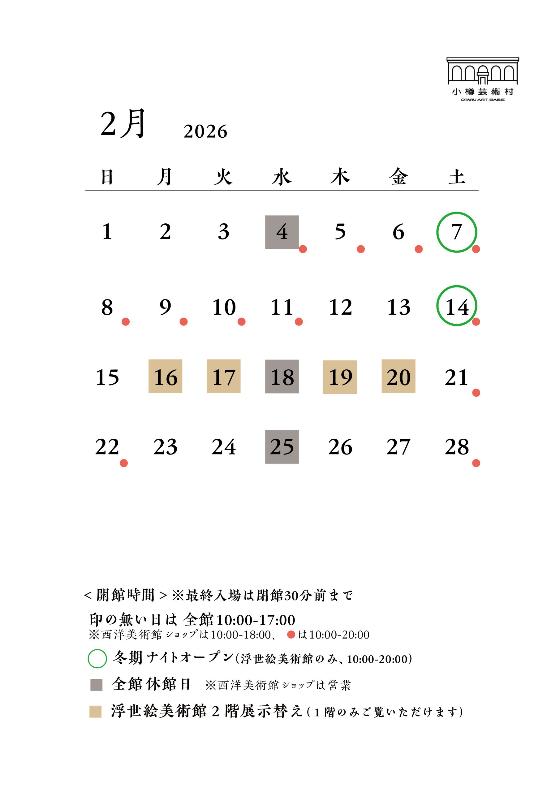 1(日) 休館日⇒毎月第4水曜日(祝日の場合はその翌日) 2月のカレンダーはコチラから・・・2月の全館休館日⇒2/4・18・25 ◎西洋美術館ショップ開館⇒10:00~18:00/2/4~2/14・21・22・28⇒10:00~20:00 ◎冬季ナイトオープン…12月1日(土)~2026年2月14日(土)浮世絵美術館のみ毎週土曜日19:00まで開館 ◎浮世絵美術館のみ・ナイトオープン10:00~20:00まで時間延長(2/7・14) ◎浮世絵美術館・2F展示入れ替えの為、1Fのみ開館(2/16~2/20) ・土日祝⇒12:00~・14:30~月曜日・水~金曜日⇒14:30~※投影時間各回30分程度 各回投影の1時間前から正面窓口で整理券を配布。各回先着30名(問) 0134-33-2523 総合博物館 館
